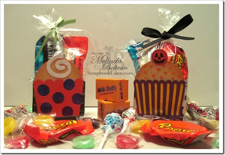 Here is a close-up of the “pumpkin” treat box. Instead of a cherry, I just created a pumpkin face to go over where the cherry should be.